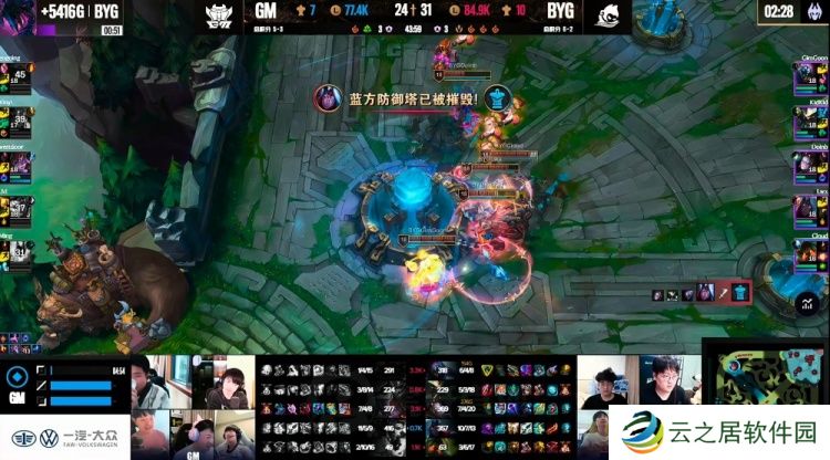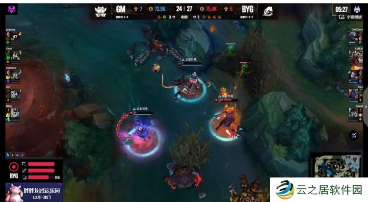 【24:20】中路团战少人的GM打野xinyi皇子先开盖了三个,但是Lwx维鲁斯在Cloud泰坦坩埚解围之后配合队友反杀掉了GM野辅!下路GimGoon贾克斯单推掉了下路高地塔!这波最终是BYG的1换2!