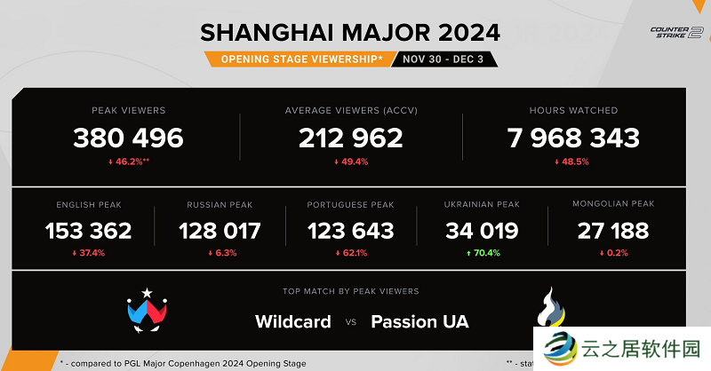 Passion UA,最高同时在线观众人数超过32.5万。总体而言,比起2024哥本哈根Major,中国观众数量较少,但淘汰赛阶段的情况可能会有所改变。