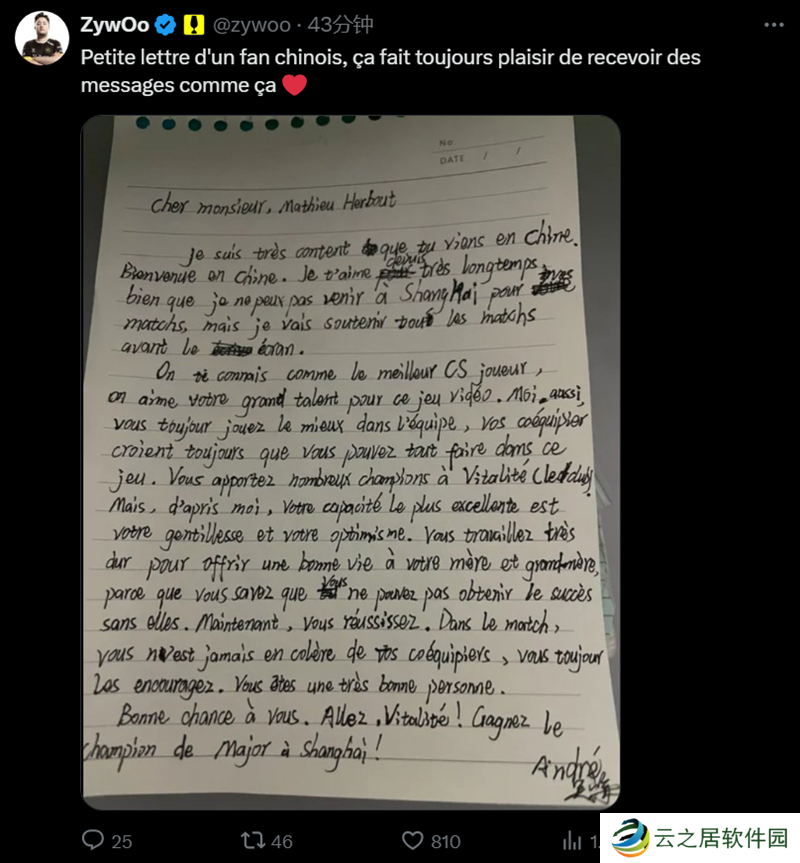 今天下午ZywOo在社交平台上发布动态,分享了一份来自中国粉丝的来信。而且这位中国粉丝还非常贴心的使用法语给ZywOo送来了寄语。