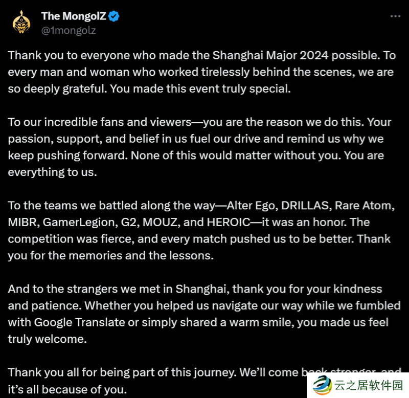 The MongolZ:感谢所有为2024年上海Major做出贡献的人。对于每一位在幕后不知疲倦工作的男士和女士们,我们深表感谢。你们让这项赛事变得真正特别。