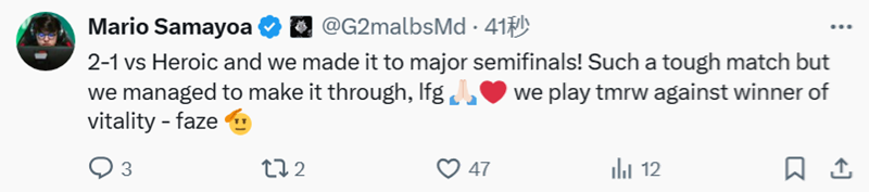 在刚刚结束的上海Major四分之一决赛中,G2战队以惊险的2-1比分击败HEROIC晋级半决赛。一起看看选手们的赛后动态吧。