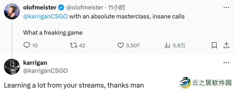 而karrigan也在评论区回复道:“从你直播中学到了很多,谢谢你兄弟。”