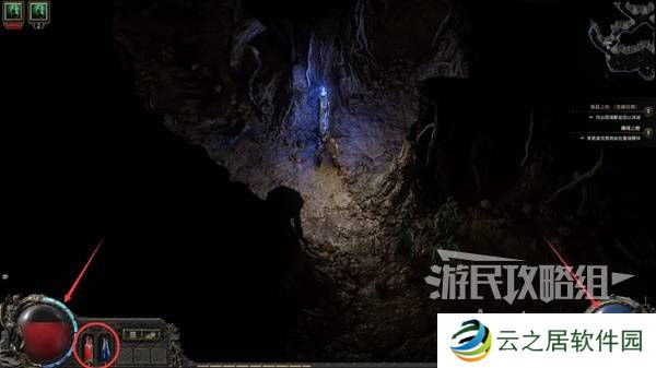 红球旁有个两个小瓶子,分别是血瓶和魔力药瓶,回城靠近水井或者在探索地图时靠近记录点石碑可恢复充能次数。下图中有蓝色火光的石碑就是记录点石碑,死亡后也会在这里复活。