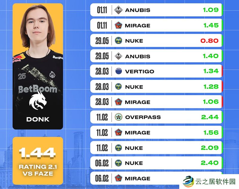 donk在今年对阵FaZe的比赛中都保持着极佳的手感,FaZe似乎始终无法找到遏制这位新星的有效办法。donk今年对阵FaZe的平均数据Rating高达1.44,其中在IEM 卡托维兹的决赛中更是打出了极为夸张的1.96 Rating。