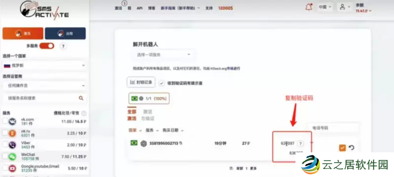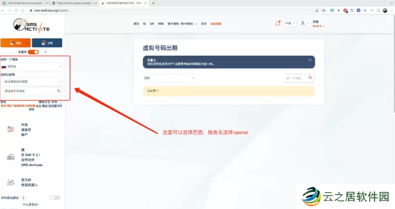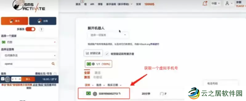 9、可以去租借虚拟号码,选择巴西,服务名选择[openai]。