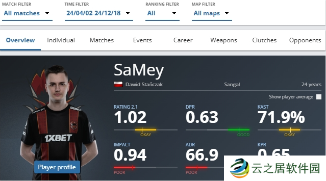 SaMey在5月从前Anonymo阵容加入Sangal,在效力期间的192张地图中平均rating为1.02,但他在线下赛事的表现明显下滑(27张地图平均rating为0.88),尤其是在对阵世界前20的队伍时表现尤为低迷(13张地图平均rating为0.81)。