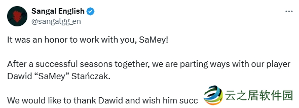 Sangal宣布了SaMey的离队,结束了这位波兰狙击手与队伍长达七个月的合作。