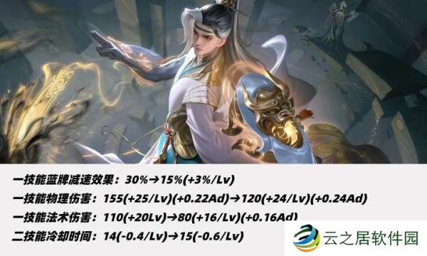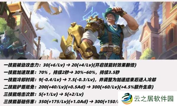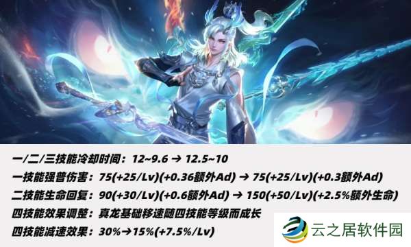 二技能攻速从15%-30%改为12.5%-25%,二技能期间攻速加成翻倍。