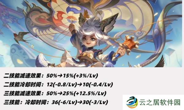 一技能蓝牌减速从30%调整至15%-30%,二技能前期增加1秒、满级不变。