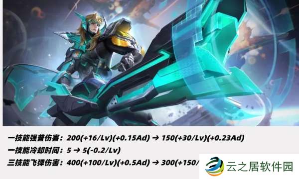 一技能下调50点基础伤害、上调14点等级成长和0.07AD加成,一技能冷却前期不变、满级缩短1秒。