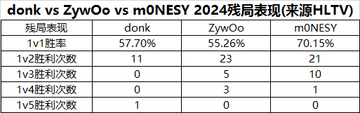 从数据上来看,m0NESY的残局表现是三人之中最顶尖的,高达7成的1v1残局胜率是高山仰止般的存在。和m0NESY类似,ZywOo也是