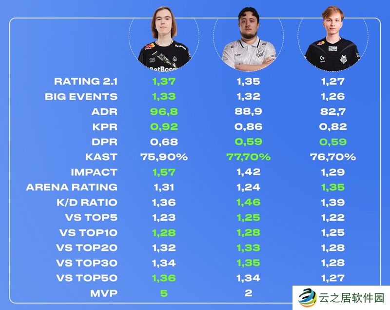 相较之下,EVP的统计三人稍显不同。ZywOo共斩获7次EVP,而m0NESY和donk分别为5次和3次。然而,EVP在TOP1的评选中只是次要因素,应该无法撼动donk的领先地位。