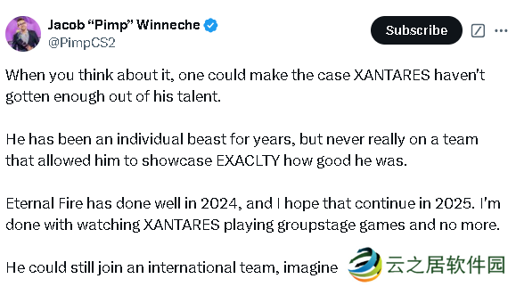 Pimp:如果你仔细想想,你会发现XANTARES并没有充分发挥他的天赋。多年来,他一直是个个人实力强大的选手,但从未真正加入过一个能够让他展示自己真正实力的团队。Eternal Fire在2024年表现出色,我希望他们在2025年能继续保持这种状态。我已经厌倦了看XANTARES参加小组赛,期待他有更多的突破。他仍然有机会加入国际队伍,想象一下