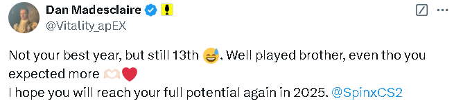 apEX:虽然这一年并不是你最辉煌的一年,但仍然取得了第13名的成绩。兄弟,表现不错,尽管你期待能有更多好成绩。我希望你在2025年能再次发挥出你的全部潜力。
