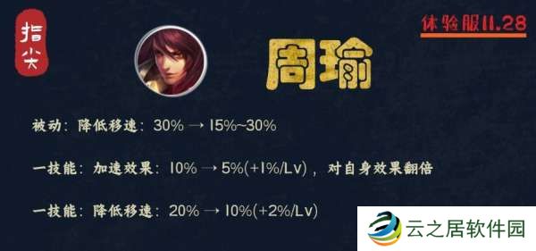 调整前10%加速,自己和队友都能享受到,调整后队友变成了5%-10%,而周瑜自己则是10%-20%,是对前期减速效果削弱进行的补偿,跑图速度会比之前更快,当然了,也因为两个减速的削弱,让周瑜对于凝冰之息的依赖值更高了。