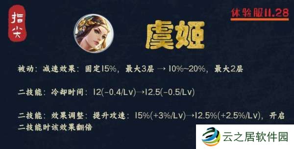 前期减速削弱,后期加强,二技能前期增加了0.5秒CD,永久性的攻速从15%-30%,变成了12.5%-25%,虽然看着削弱了最多5%的攻速,但开启二技能之后加速翻倍。