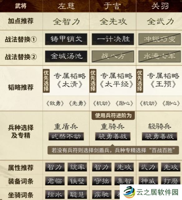 于吉兵符 选择重骑兵,兵种专精选择“骁勇善战”;无兵符选择剑盾兵,兵种专精选择“百战百胜”