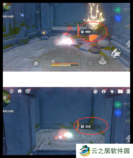 9、穿越裂隙返回电梯位置,启动电梯向上(无需重新召唤,电梯已因先前操作而设定为上行)并触摸两个铭印: