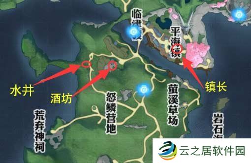 【失踪的孩子】首先去询问镇长(977.691),然后去酒坊找周杭(779.618)谈话,最后去水井处(704.658)对话,可以获得藏品奇怪的手镯,之后回去找怀柔,获得任务:通关神祠困难,即可。(位置如下图)