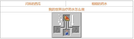 8、治疗药水,顾名思义使用和可以回复玩家生命值的药水。用粗制药水和闪烁的西瓜炼制,可以回复三格血,再和萤石炼制回复六格血的2级治疗药水。如果和发酵蛛眼炼制就会变成伤害药水,效果是扣三格血,加萤石炼制扣六格血的2级伤害药水。