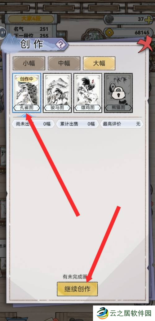 2、进入创作区域后,选择“大幅”选项,你将看到正在创作的孔雀图案。在此处点击“继续创作”按钮以继续。